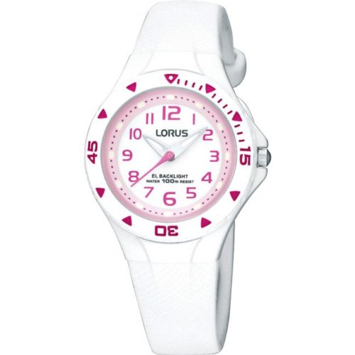 Lorus by Seiko Children Watch. Japanese Movement. Round White Dial. Mineral Crystal Glass. 100 Meter Water Resistant. Back Light Function. Silver Case & White Plastic Bezel. Stainless Steel Case Back. Case Diameter: 28mm. Case Thickness: 10mm. White Resin Strap. Band Width: 12mm. Stainless Steel Buckle. This Lorus Watch Comes with 2 Years Lorus Warranty and A Presentable Gift Box.