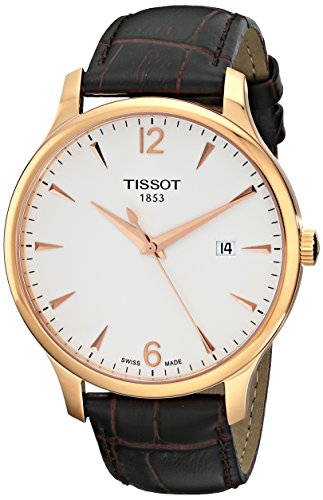 Mens Tissot Tradition watch in a classic design in PVD rose plating and leather. The white dial is set with elegant slimline hour markers and has a date function.